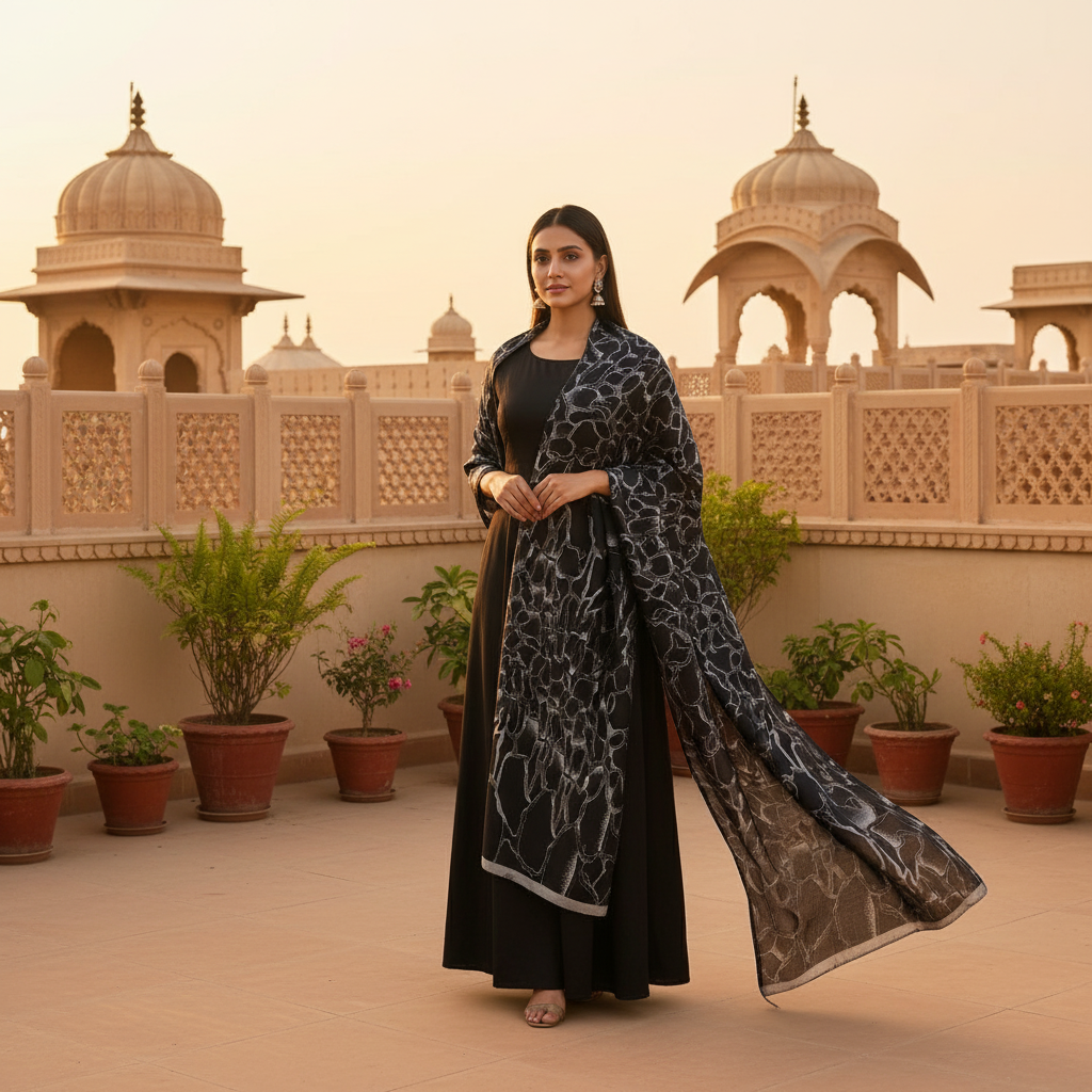 Noir Silver Luxe features a deep black satin base highlighted with abstract metallic silver strokes — giving it a dramatic, high-fashion glow reminiscent of couture runway pieces.