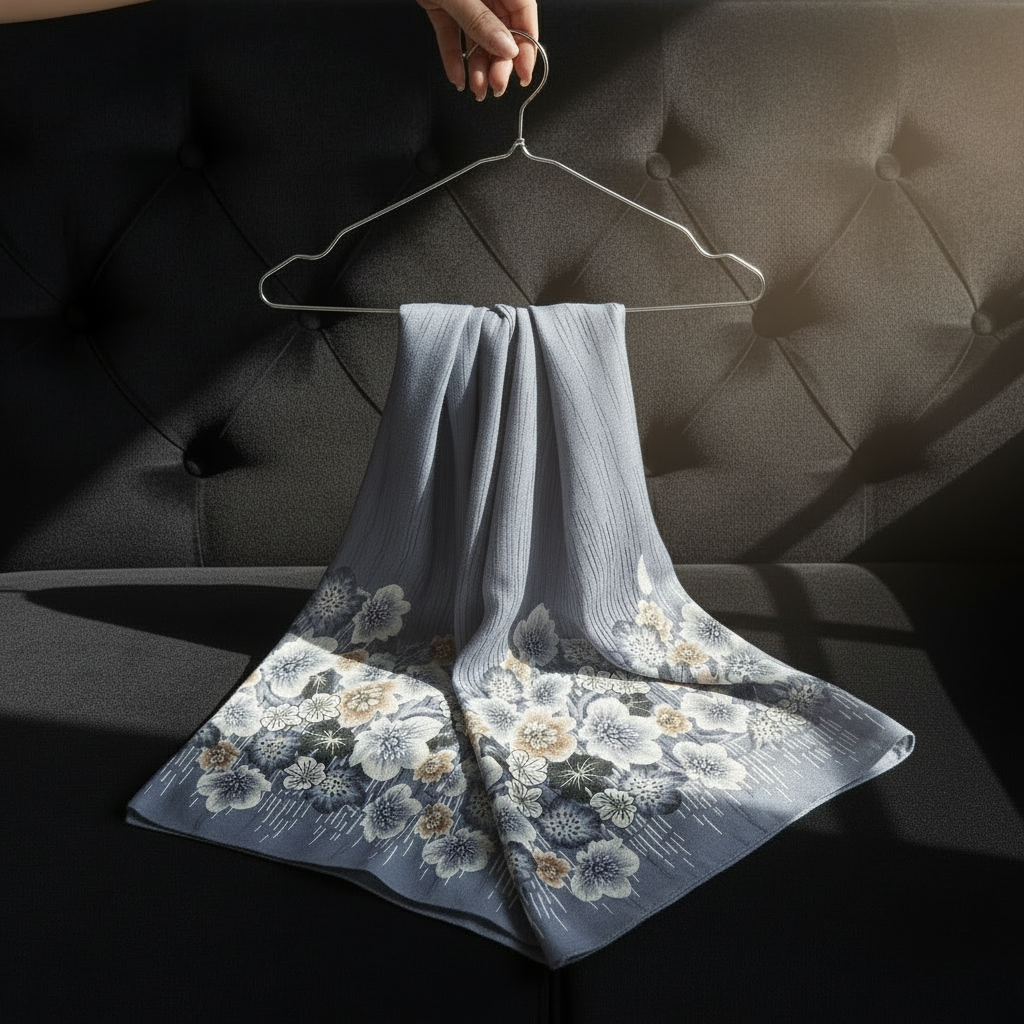 Featuring a soft dusty-blue base with delicate floral detailing along the borders, this viscose piece blends comfort with effortless beauty.