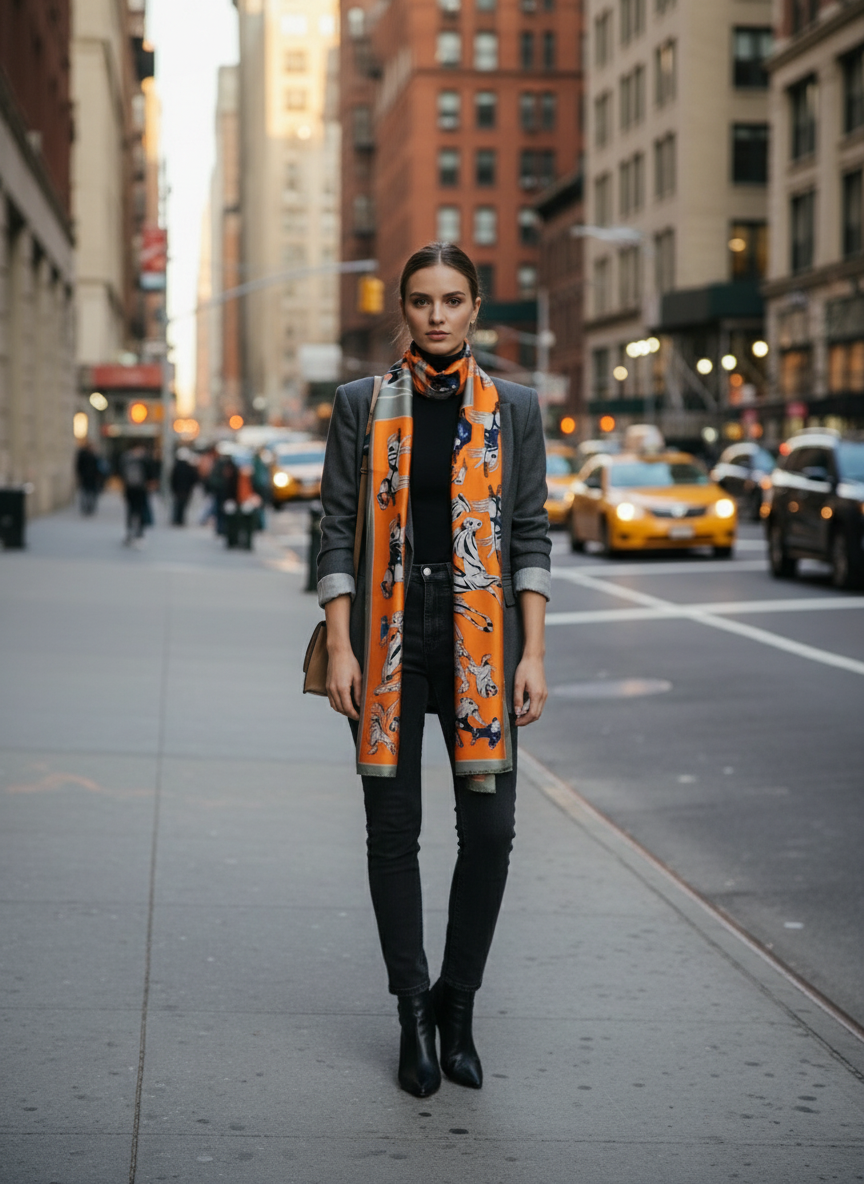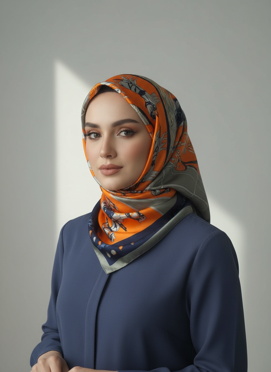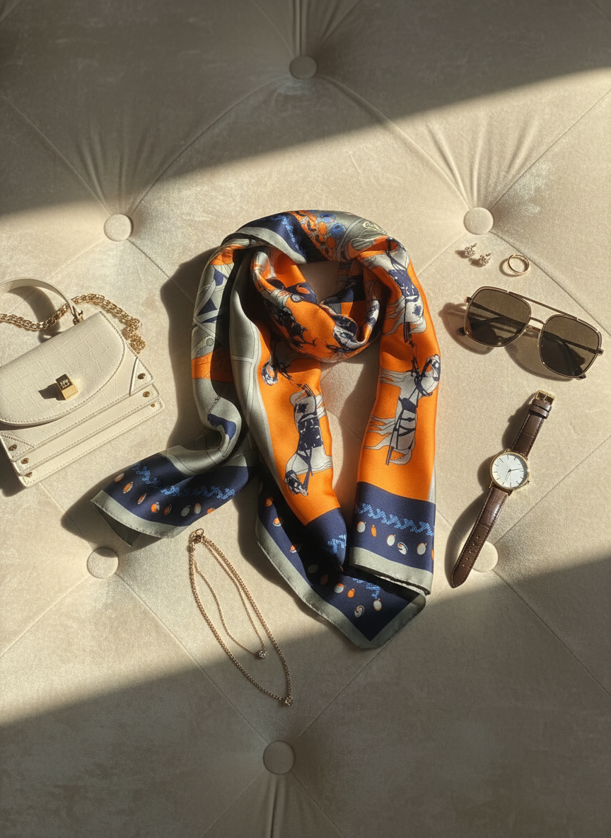 Bold, artistic, and richly detailed — the Trois Chevaux Scarf is inspired by French equestrian couture, blending graceful horse illustrations with clean geometric panels in burnt orange, dove grey, and deep navy.