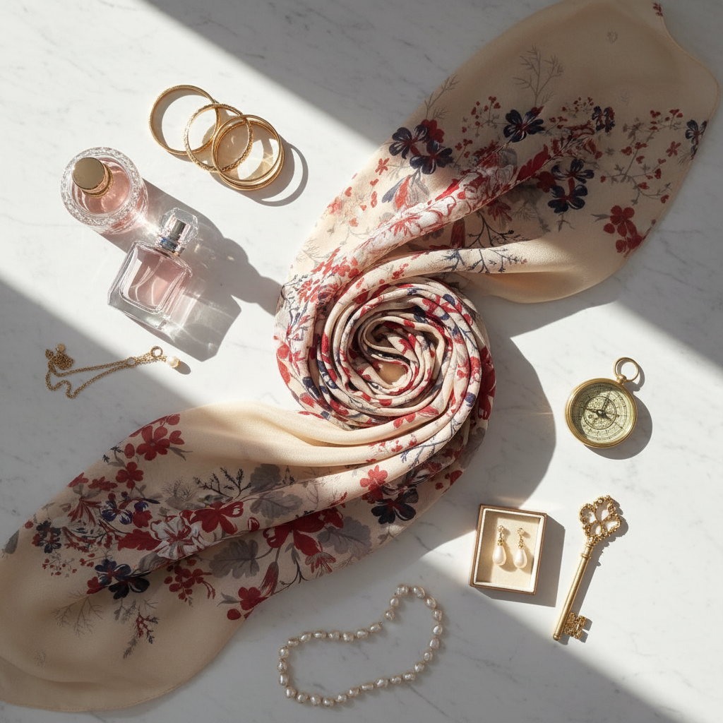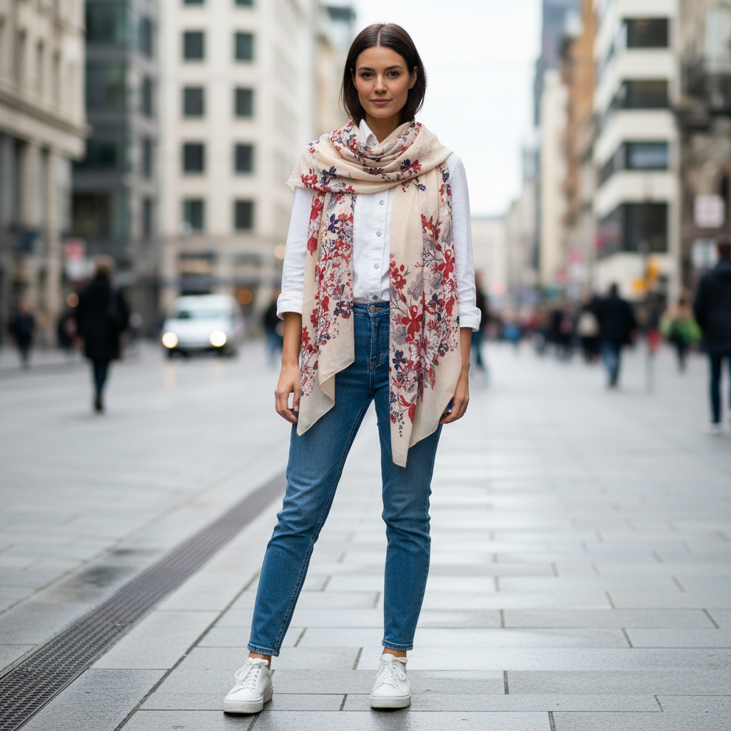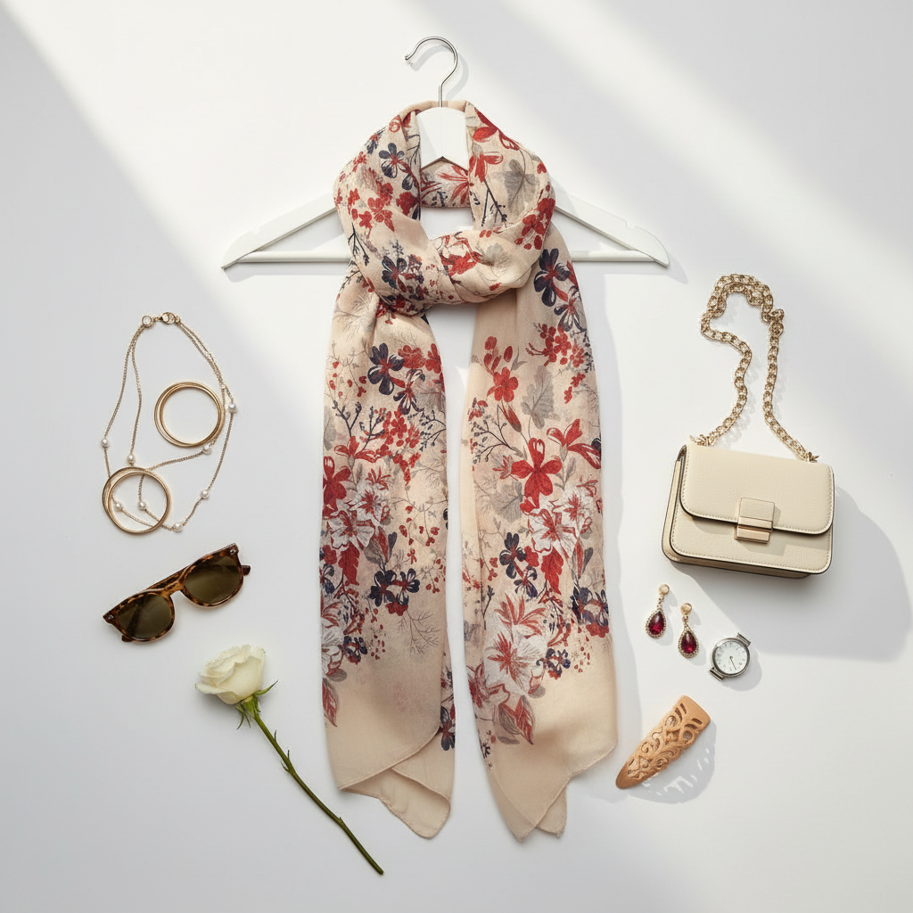 Crafted from a premium lightweight fabric, it drapes gently with a soft, airy flow — perfect for everyday chic or special occasions. This scarf brings a touch of poetic charm to any outfit and is ideal for women who love subtle glamour with floral artistry.