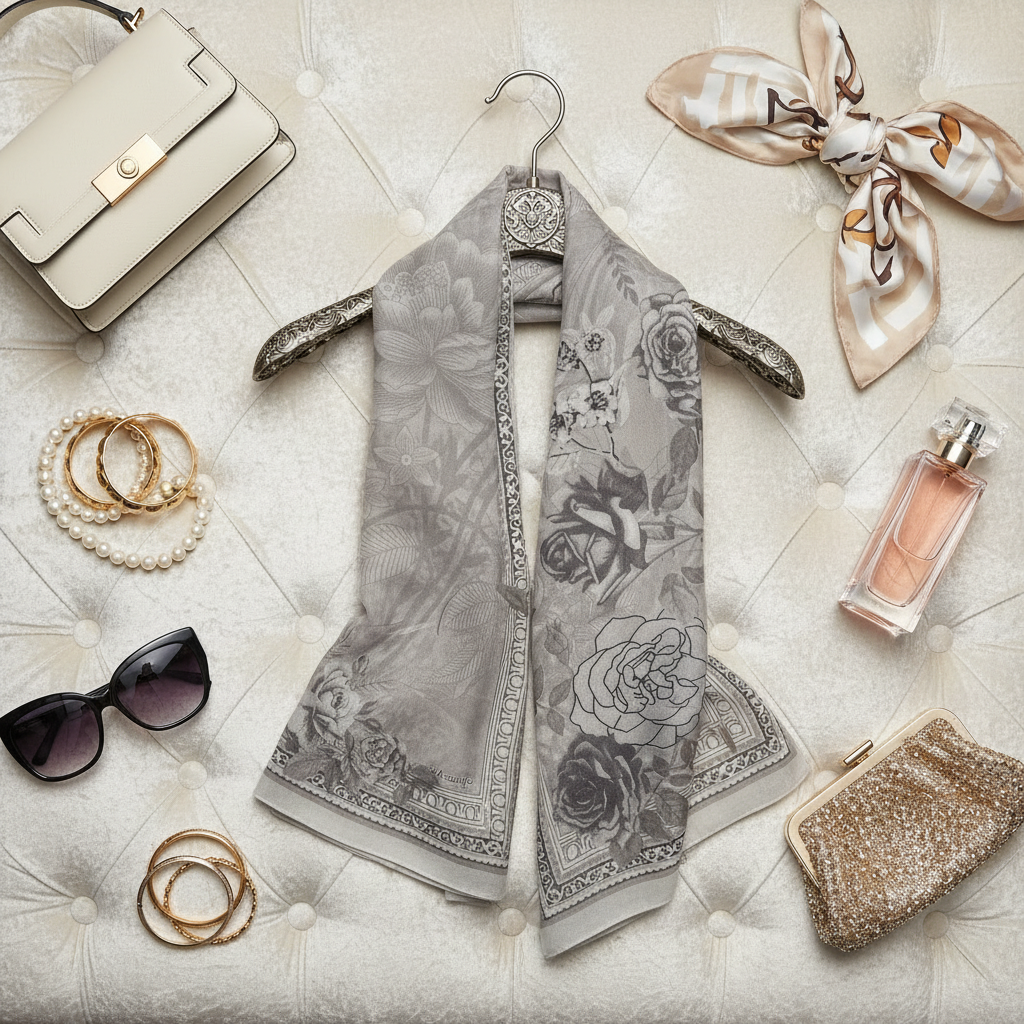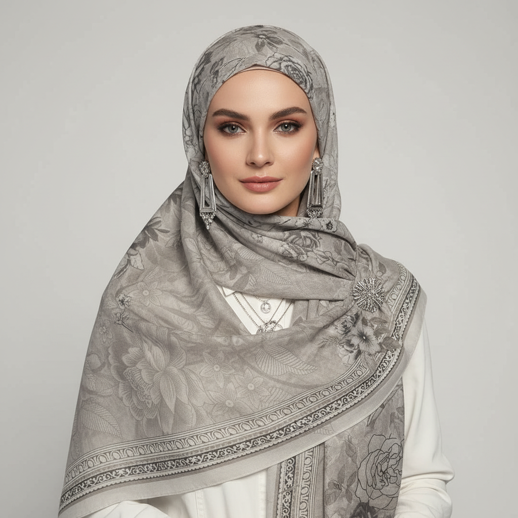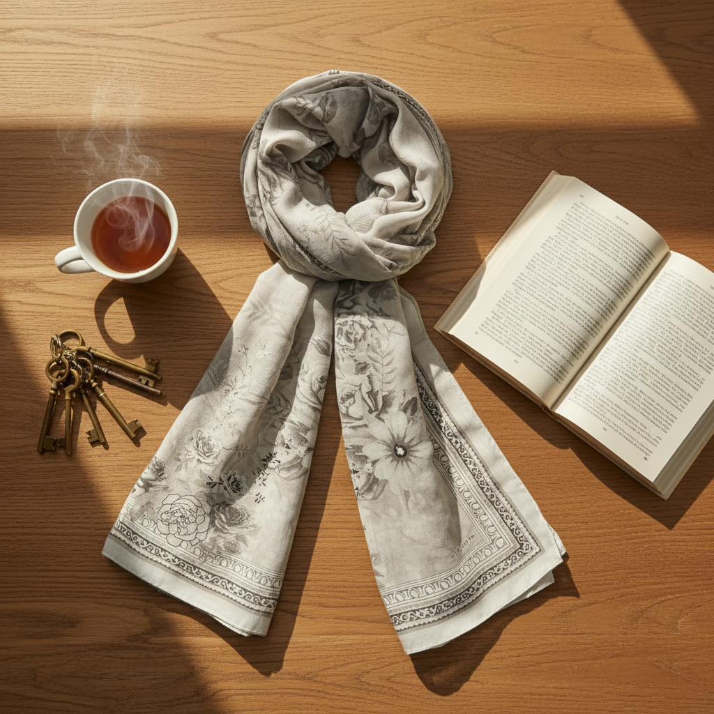 Ash Petal Elegance blends delicate floral artistry with a soft grey base, creating a scarf that is both subtle and undeniably luxurious.