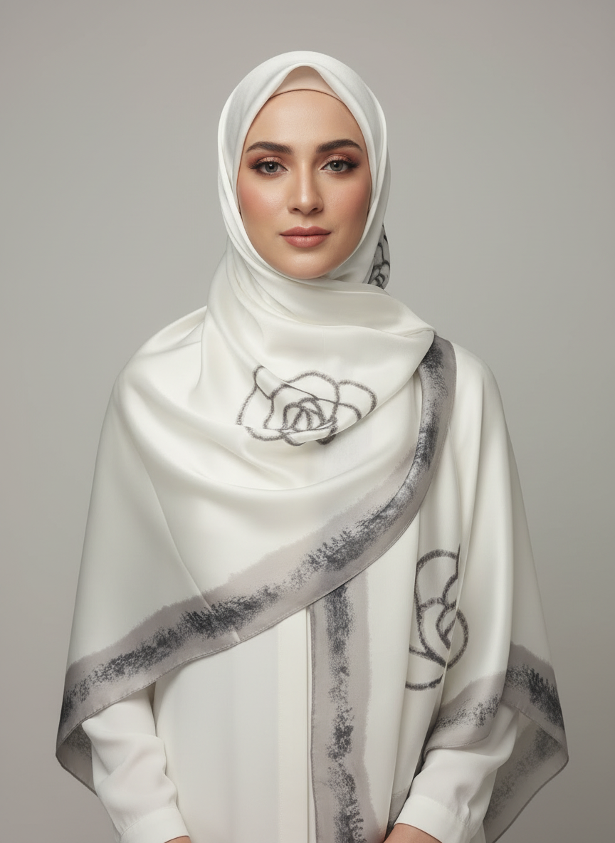 Lightweight, silky, and sophisticated, it softly drapes as a hijab, shoulder wrap, or styling scarf — elevating every outfit with effortless refinement.