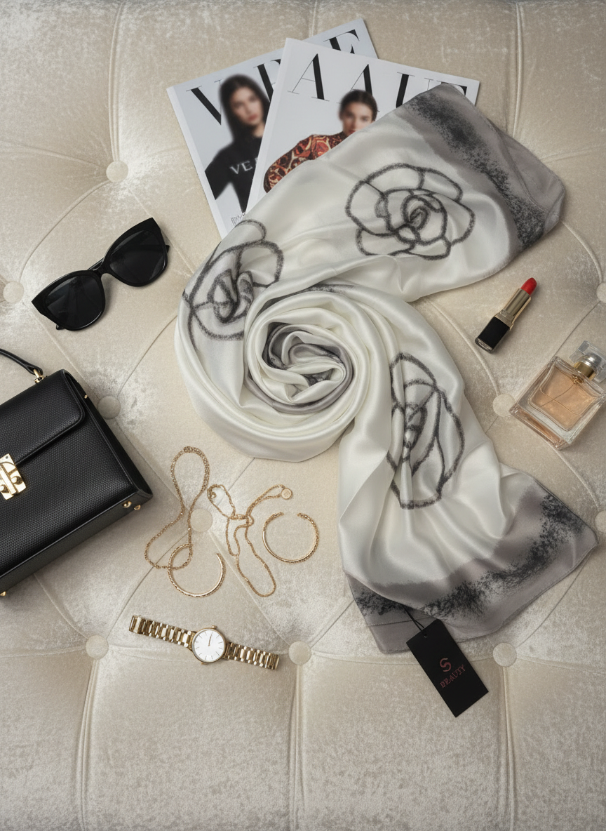 Luxury Satin Scarf | Minimal Rose Print | Soft Signature Drape