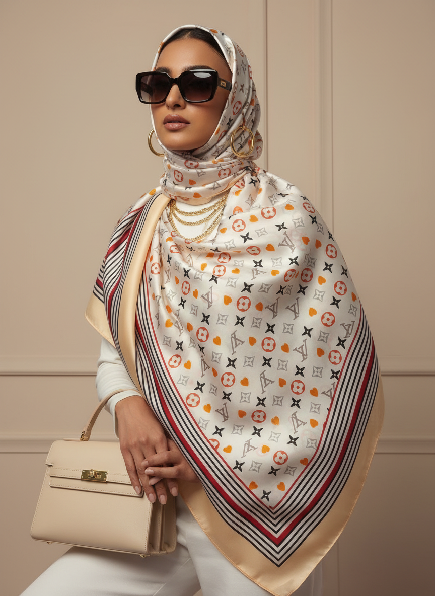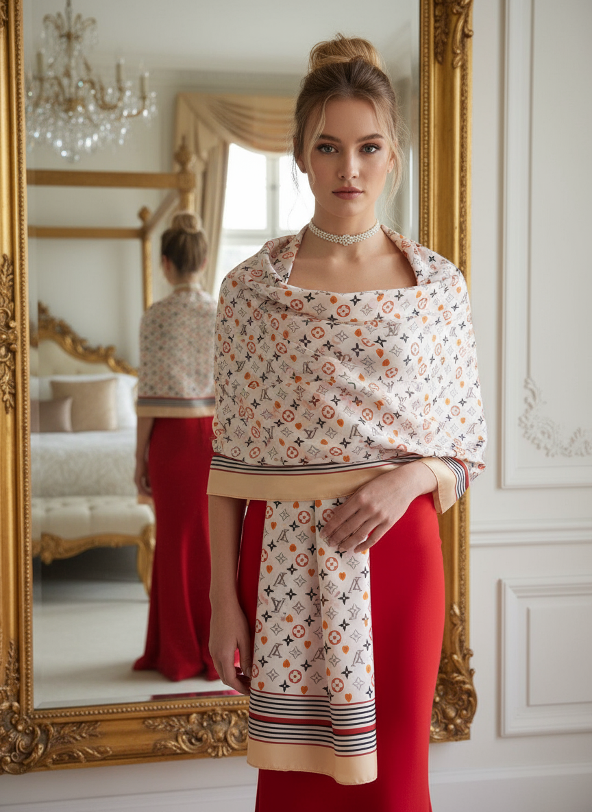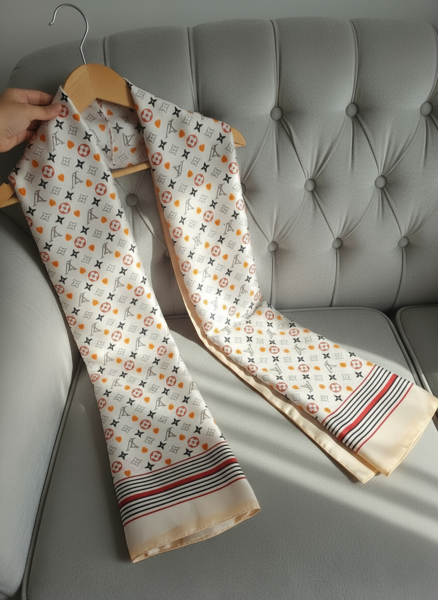 A beautifully refined scarf designed for women who appreciate subtle elegance and timeless fashion. With its soft ivory base and delicate monogram detailing, this piece blends effortless luxury with everyday wearability.