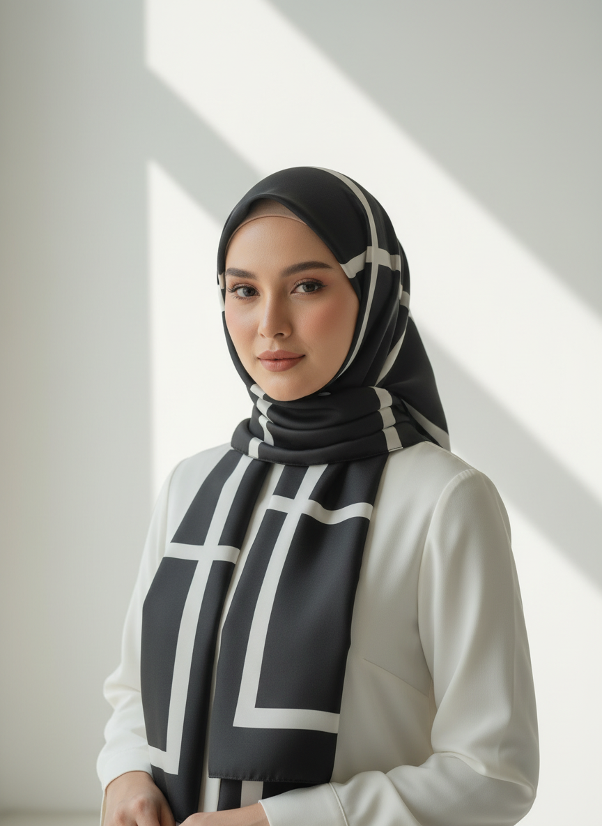 A bold yet refined accessory designed for effortless elegance. Featuring a modern monochrome grid pattern on soft silk-feel satin, this scarf instantly elevates any outfit into a polished, editorial look.