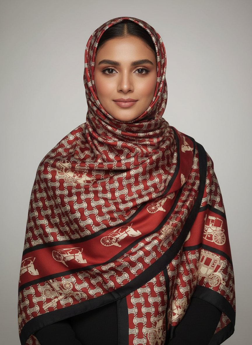 A timeless classic, crafted for the woman who carries elegance effortlessly. This scarf features a rich red base adorned with vintage equestrian-inspired motifs—bringing together luxury, art, and heritage in one statement piece.